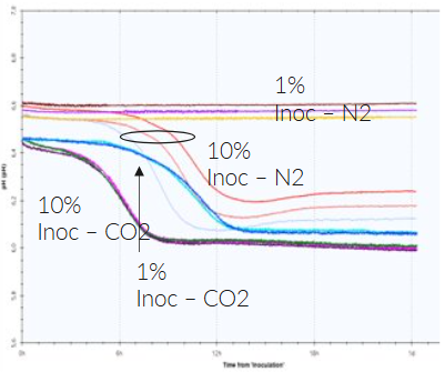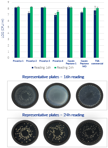 Results obtained for genetically modified Saccharomyces cerevisie strain producing GFP. The strain was grown in Micro Titer Plate at 28°C under agitation with 10 g/L Soy Peptone or Yeast Peptone 3 - in a culture media derived from CP broth. Better performance are observed with the yeast peptone.