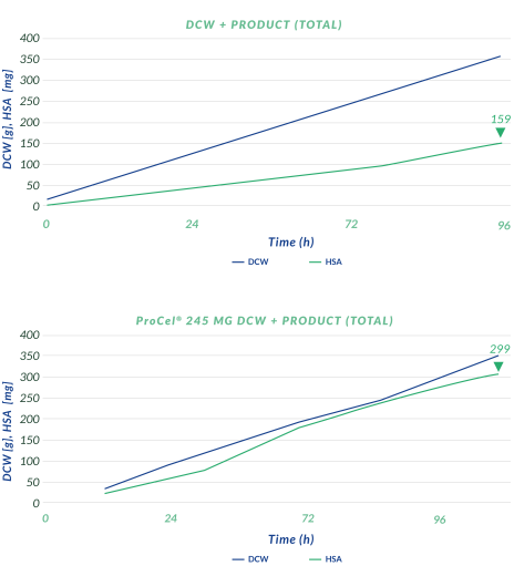 P. pastoris, grown in bioreactor, expressing Human Serum Albumin (HSA) on plasmid under control of the constitutive GAP promoter in chemically defined media with 8% of ProCel® 245 MG. The recombinant HSA yield increased 88% when the media is supplemented with a ProCel® 245 MG yeast extract.
